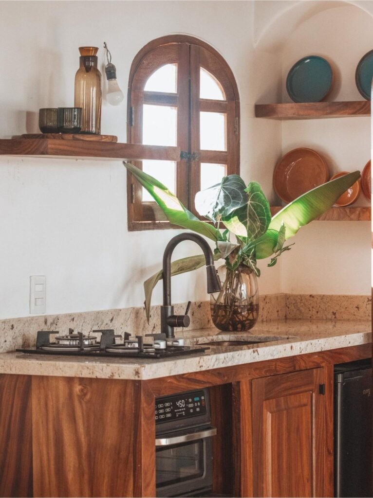 Residences at our green-luxury intimate hotel on the Nayarit coast feature hand-worked Parota cabinetry, polished granite countertops. Also provided are premium appliances—including a gas stove, air fryer, refrigerator, and coffee station.